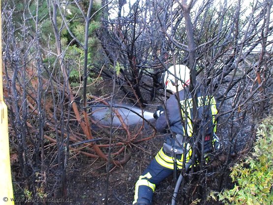 Am Nachmittag des 07.11.2009, kam es ca. 16.00 Uhr zu einem Kleinbrand. Die Feuerwehr Bernsbach traf nach wenigen Minuten am Einsatzort ein, zu diesem Zeitpunkt war das Feuer schon gelöscht! Offenbar hatten Anwohner Gartenarbeiten mit einem Gasbrenner verrichtet und somit das Feuer entfacht, welches auf umliegende Büsche übergriff. Dabei wurde das angrenzende Wohnhaus durch das Feuer gefährdet. Die Bernsbacher Feuerwehr war mit vier Fahrzeugen vor Ort und übernahm Restlöscharbeiten. Weiterhin musste eine Straßenlaterne, die in Mitleidenschaft gezogen wurde vom Notfalldienst einer Bernsbacher Elektrofirma auf Ihre Funktion hin überprüft werden. Alle Fahrzeuge waren nach kurzer Zeit wieder einsatzbereit. |